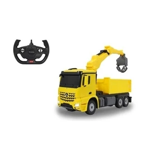 Moeten er grote boomstammen worden geladen? Grote ladingen moeten worden verplaatst? Geen probleem voor de op afstand bestuurbare Mercedes-Benz Arocs laadkraan uit de Jamara licentieserie. U kunt de kraan handmatig uitschuiven en draaien en de kiepbak op en neer bewegen, zodat zelfs de meest gecompliceerde handelingen kunnen worden uitgevoerd. Met de 2,4 GHz radiografische afstandsbediening kunt u het voertuig naar de volgende werklocatie rijden. Dit officieel gelicenseerde voertuig zal elke kleine vrachtwagenchauffeur bekoren. En vanaf nu wordt elke spoedrit een realistische ervaring.
